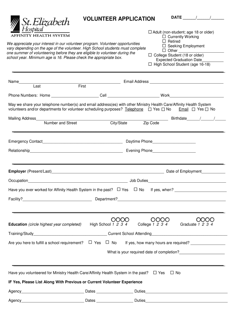 Get the free VOLUNTEER APPLICATION - Affinity Health System
