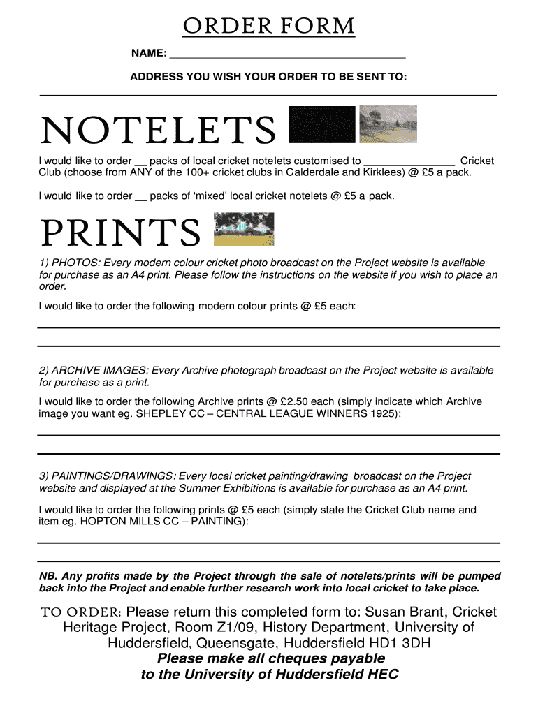 ORDER FORM NAME: ADDRESS YOU WISH YOUR ORDER TO BE SENT TO: NOTELETS I would like to order packs of local cricket notelets customized to Cricket Club (choose from ANY of the 100+ cricket clubs in