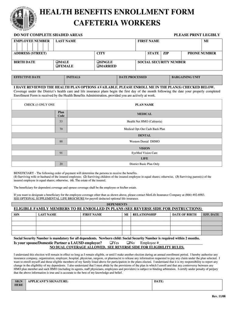 Get the free HEALTH BENEFITS ENROLLMENT FORM CAFETERIA WORKERS - LAUSD - notebook lausd