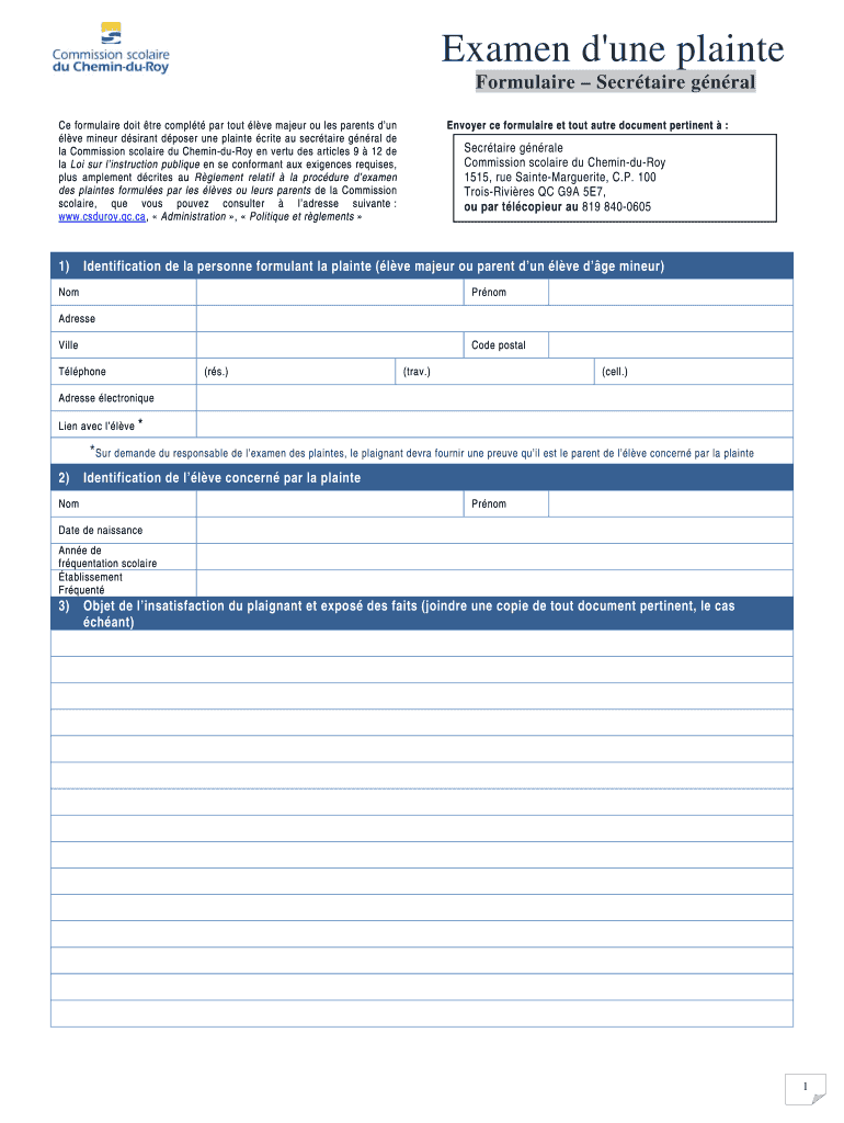 Get the free Examen d 'une plainte - csduroy.qc.ca - csduroy qc