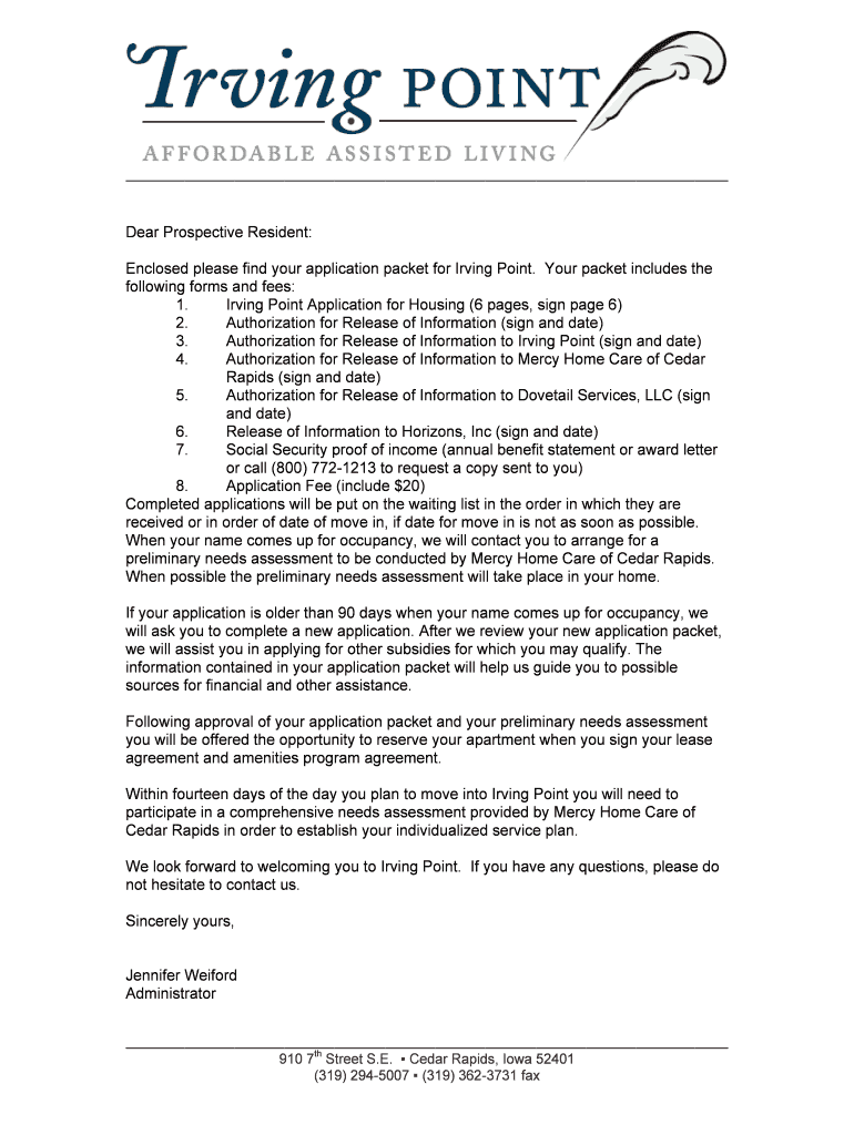 Dear Prospective Resident: Enclosed please find your application packet for Irving Point. Your packet includes the following forms and fees: 1. Irving Point Application for Housing (6 pages, sign