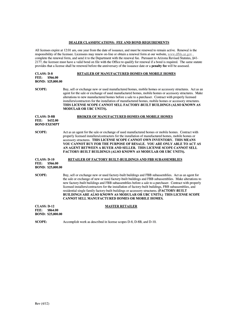 Get the free DEALER CLASSIFICATIONS: FEE AND BOND REQUIREMENTS - dfbls az