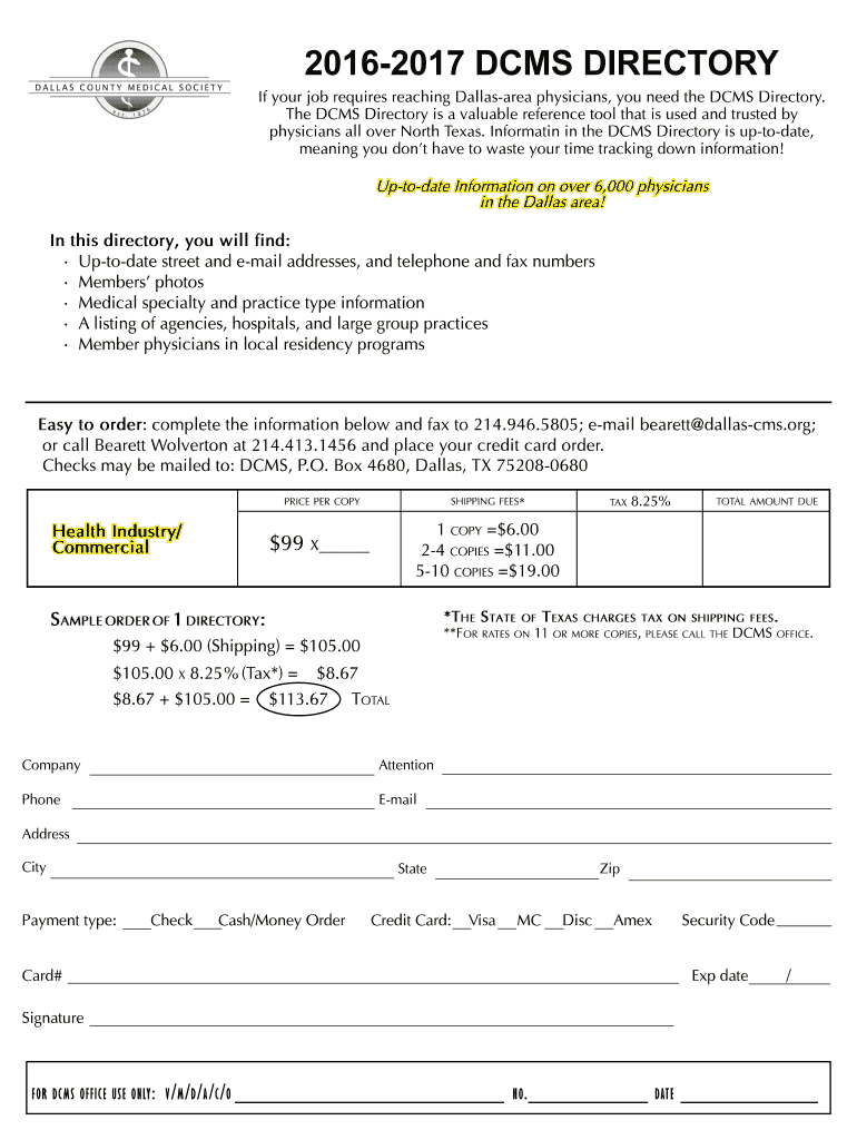 20162017 DAMS DIRECTORY If your job requires reaching Dallas area physicians, you need the DAMS Directory. The DAMS Directory is a valuable reference tool that is used and trusted by physicians all