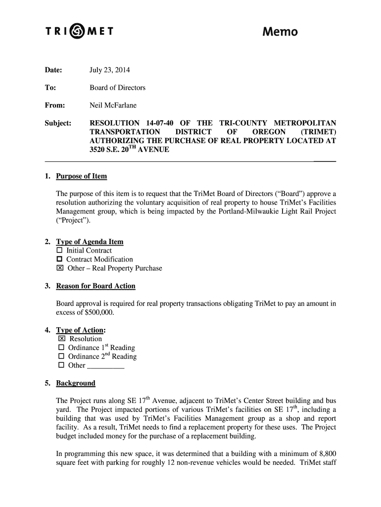 Date: July 23, 2014, To: Board of Directors From: Neil McFarlane Subject: RESOLUTION 140740 OF THE COUNTY METROPOLITAN TRANSPORTATION DISTRICT OF OREGON (TRIVET) AUTHORIZING THE PURCHASE OF REAL PROPERTY