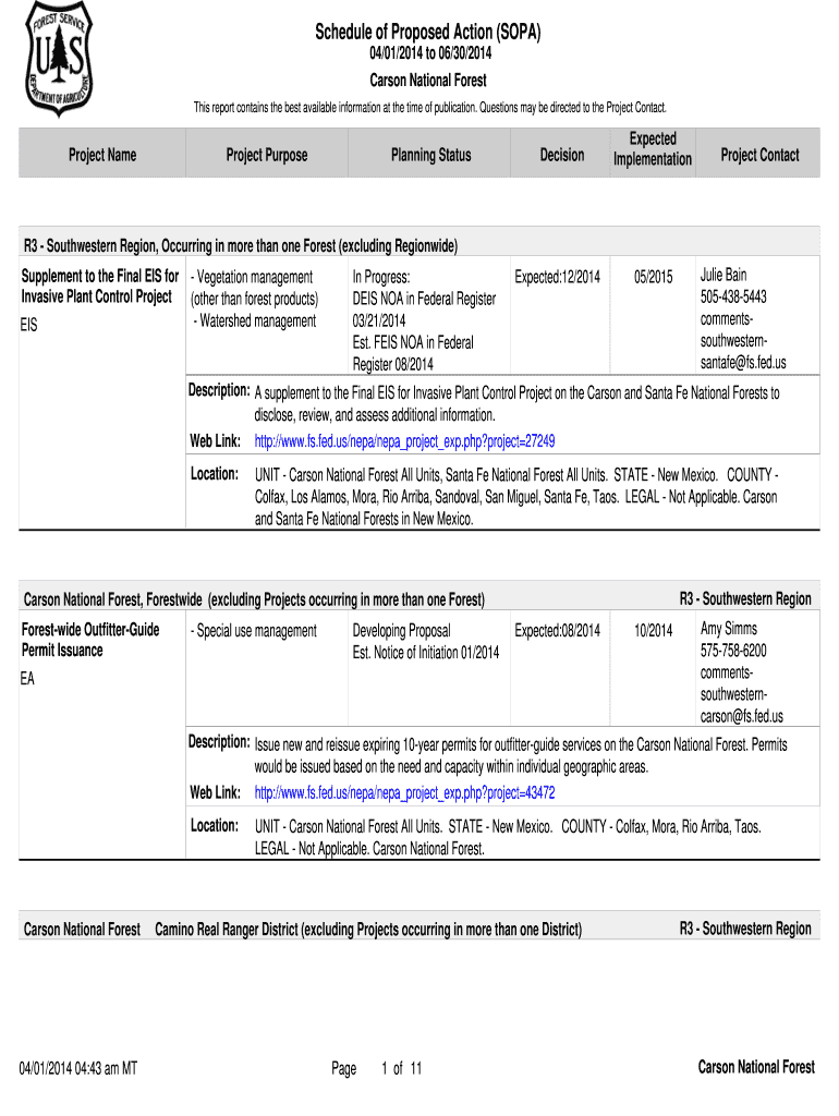 Schedule of Proposed Action (SOPA) 04/01/2014 to 06/30/2014 Carson National Forest This report contains the best available information at the time of publication. Questions may be directed to the