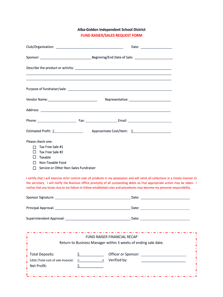Alba Golden Independent School District FUND RAISER/SALES REQUEST FORM Club/Organization: Sponsor: Date: Beginning/End Date of Sale: Describe the product or activity: Purpose of fundraiser/sale: Representative: