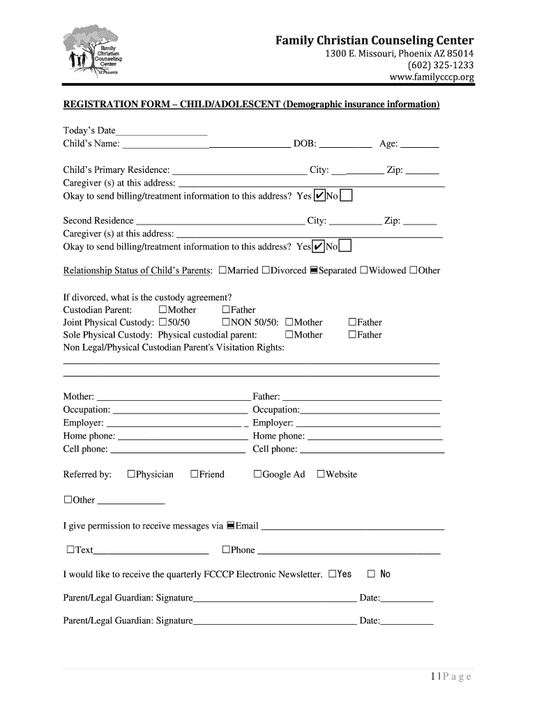 Family Christian Counseling Center 1300 E. Missouri, Phoenix AZ 85014 (602) 325-1233 www.familycccp.org 1 P a g e REGISTRATION FORM CHILD/ADOLESCENT ...