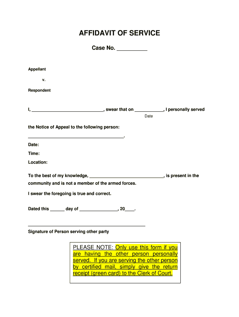 AFFIDAVIT OF SERVICE Case No. Appellant v. Respondent I, swear that on, I personally served Date the Notice of Appeal to the following person:. Date: Time: Location: To the best of my knowledge, is