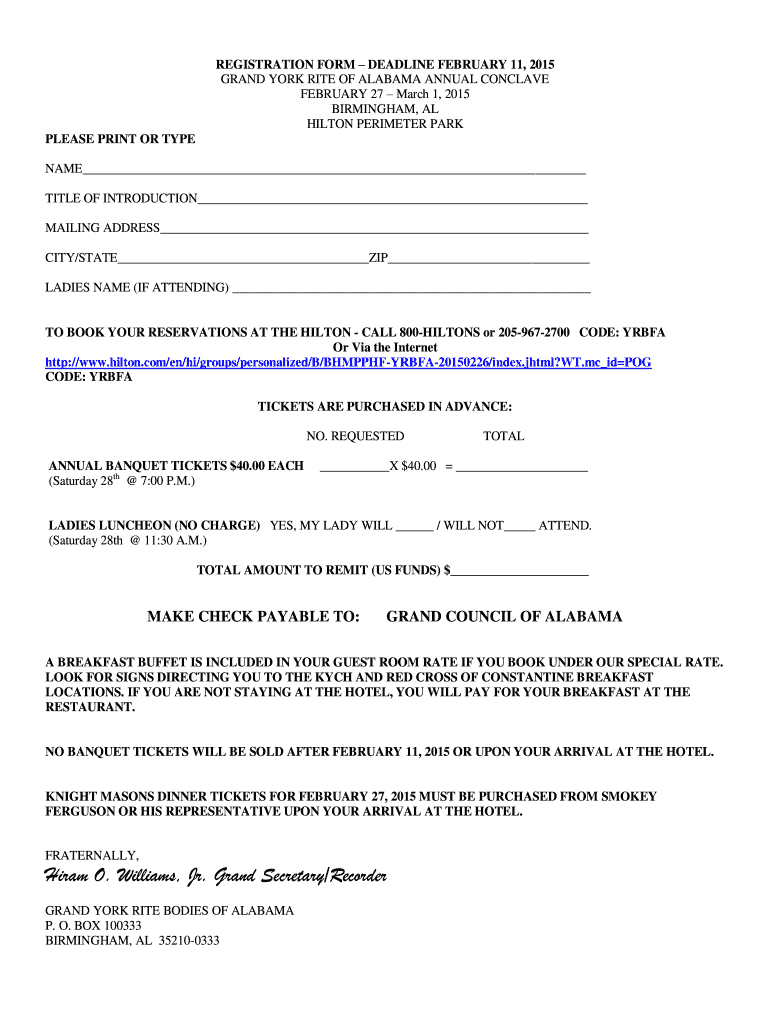 F: 0000STATES AL Invitation Letter-General-In State or Out State.doc THE GRAND YORK RITE BODIES OF FREEMASONRY STATE OF ALABAMA Hiram O. Williams, Jr ...