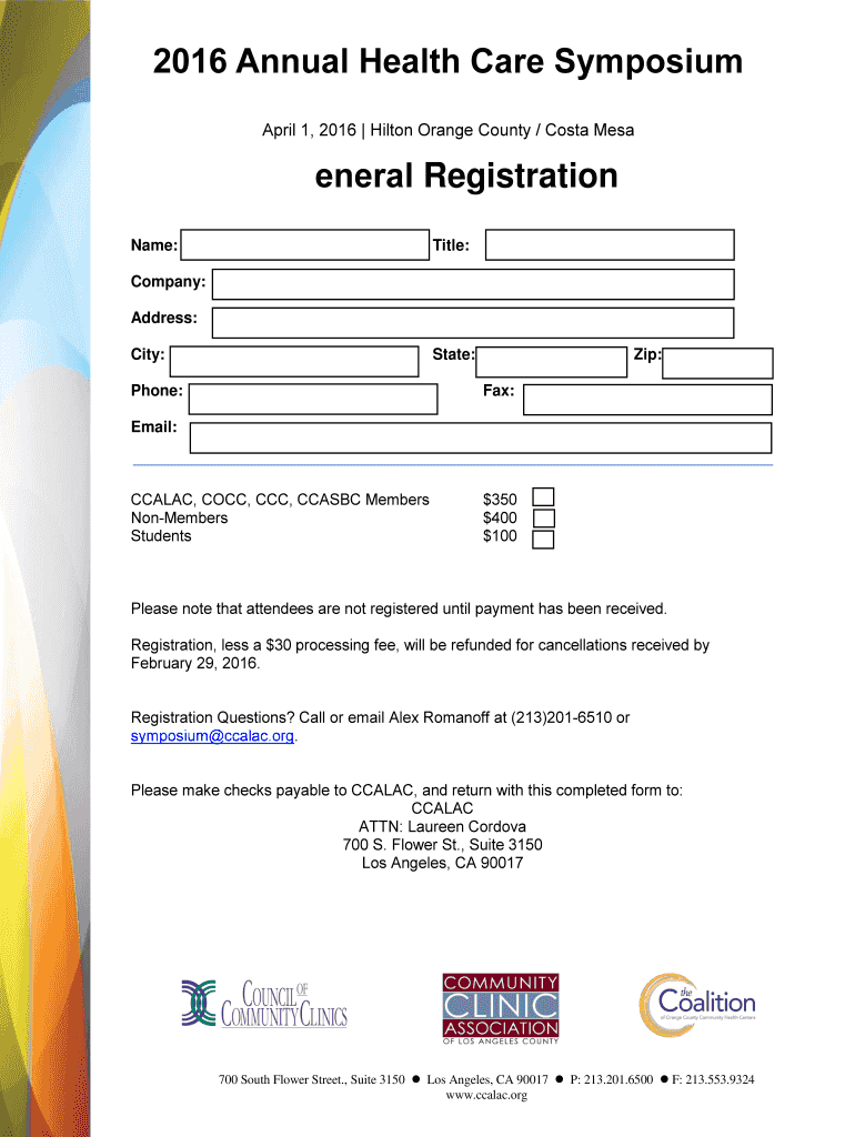 700 South Flower Street., Suite 3150 Los Angeles, CA 90017 P: 213.201.6500 F: 213.553.9324 www.ccalac.org 2016 Annual Health Care Symposium