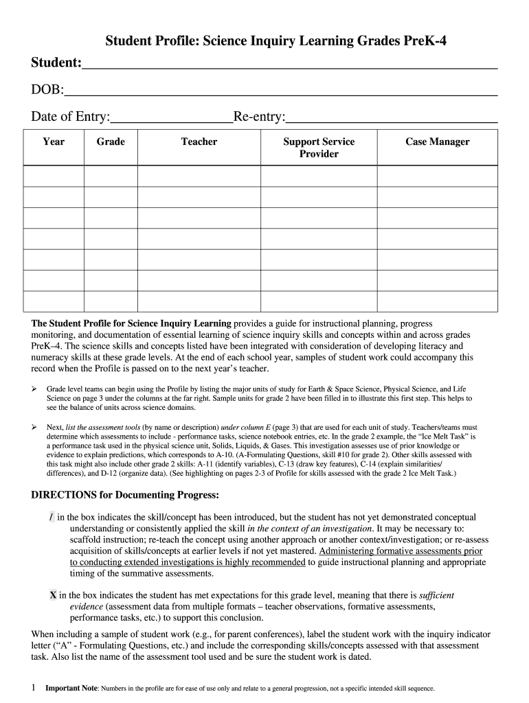 Student Profile: Science Inquiry Learning Grades PreK4 Student: DOB: Reentry: Date of Entry: Year Grade Teacher Support Service Provider Case Manager The Student Profile for Science Inquiry Learning
