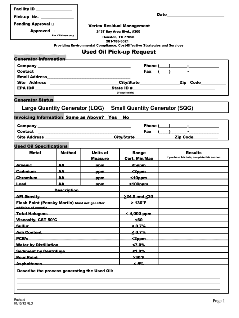 Used Oil Pick-up Request. Generator Information. Company Phone () — Contact ...