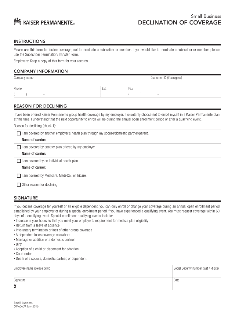 Get the free Declination of coverage (PDF) - kp.org - Kaiser Permanente