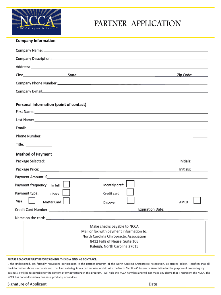 2016 Improved Partner Packages. Items .... I, the undersigned, am formally requesting participation in the partner program of the North Carolina Chiropractic ...