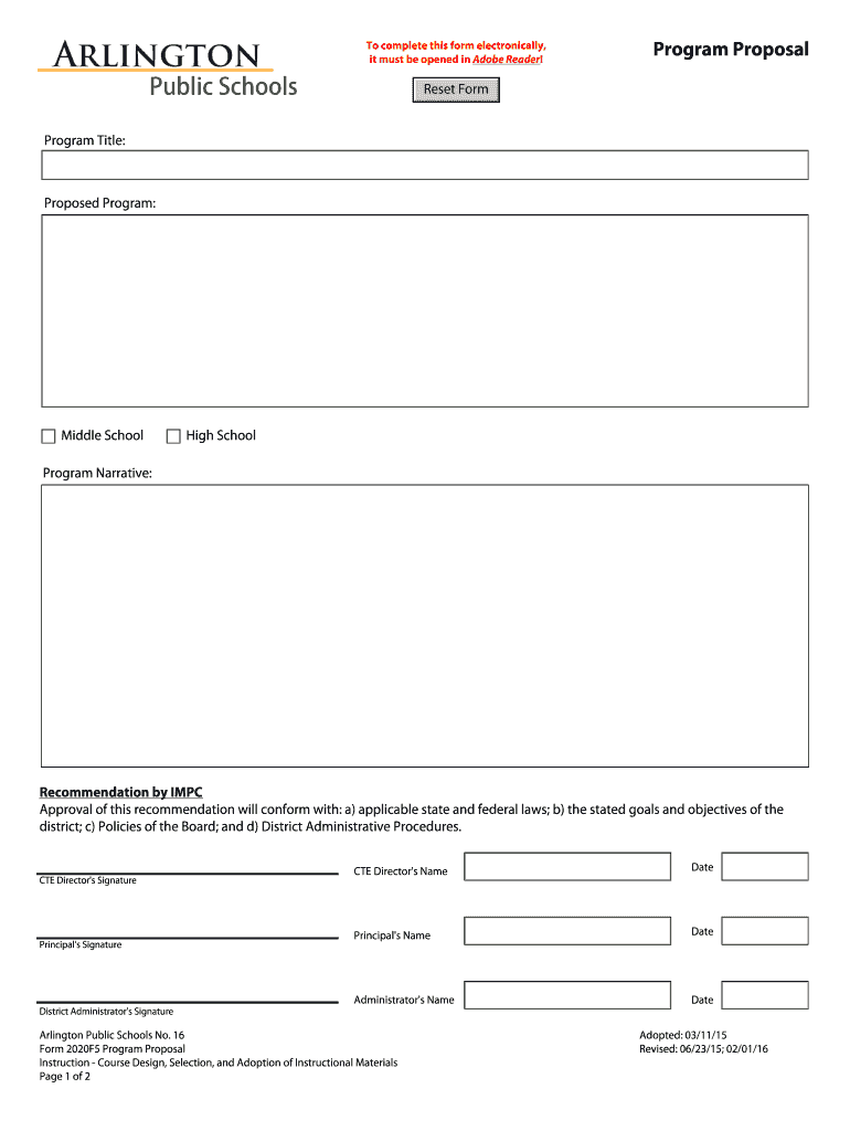 Program Proposal. Program Title: Proposed Program: Program Narrative: Arlington Public Schools No. 16 Adopted: 03/11/15 Form 2020F5 Program Proposal ...