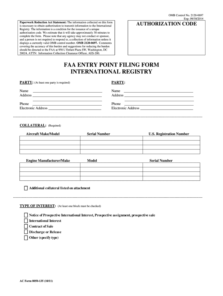 OMB Control No. 2120-0697 Exp. 09/30/2014 AC Form 8050-135 (10/11) U.S. Department of Transportation Federal Aviation Administration Aircraft