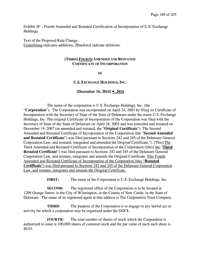Page 180 of 205 Exhibits 5F Fourth Amended and Restated Certification of Incorporation of U.S. Exchange Holdings Text of the Proposed Rule Change Underlining indicates additions; Brackets indicate
