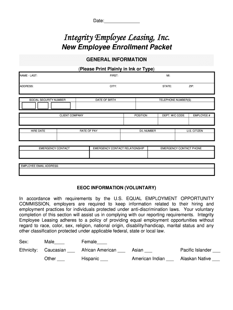 Date: Integrity Employee Leasing, Inc. New Employee Enrollment Packet GENERAL INFORMATION (Please Print Plainly in Ink or Type) NAME — LAST ...