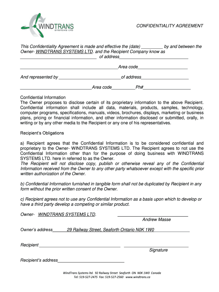 CONFIDENTIALITY AGREEMENT This Confidentiality Agreement is made and effective the (date) by and between the Owner INTRANS SYSTEMS LTD. And the Recipient Company know as of address Area code And represented