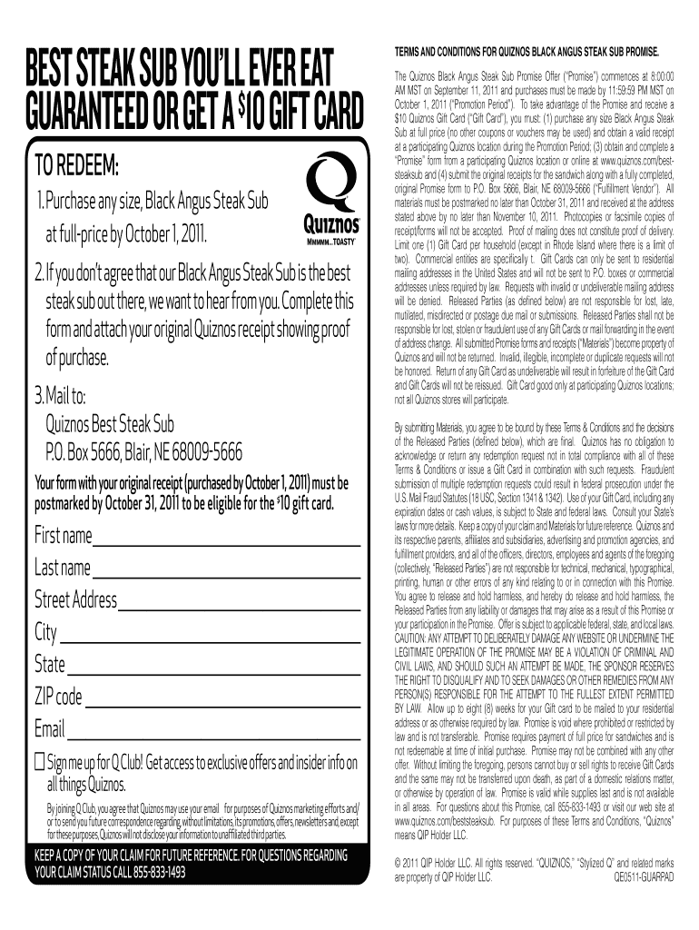 The BEST STEAK SUB YOU'LL EVER EAT GUARANTEED OR GET A ×10 GIFT Cards TO REDEEM: 1. Purchase any size, Black Angus Steak Sub at full price by October 1, 2011. 2. If you don't agree that our Black