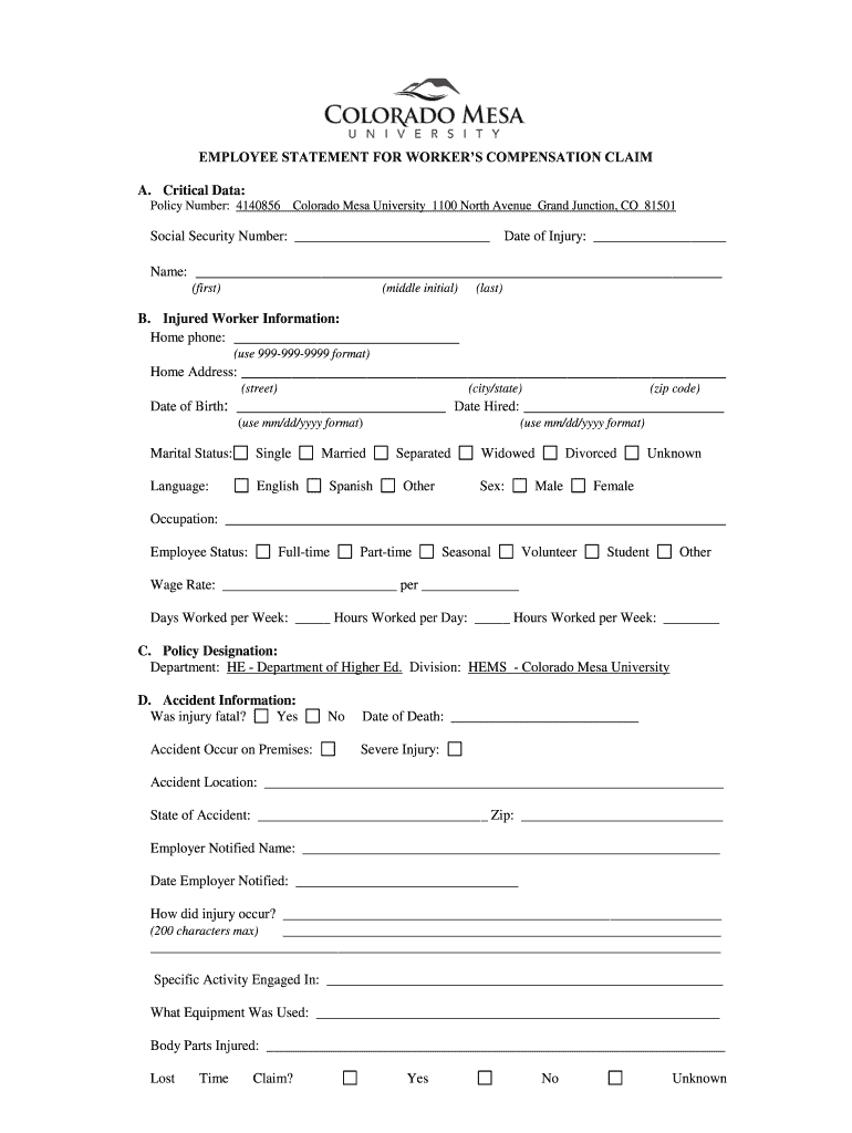 EMPLOYEE STATEMENT FOR WORKERS COMPENSATION CLAIM A. Critical Data: Policy Number: 4140856 Colorado Mesa University 1100 North Avenue Grand Junction, CO 81501 Social Security Number: Name: Date of