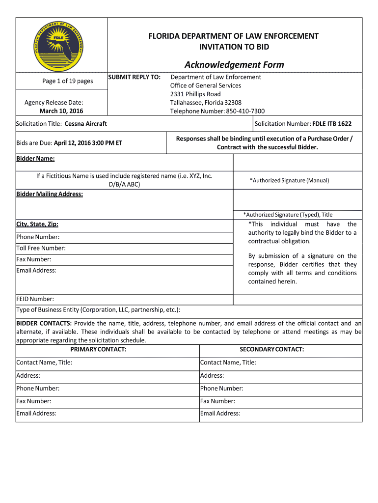 FLORIDA DEPARTMENT OF LAW ENFORCEMENT INVITATION TO BID Acknowledgement Form Page 1 of 19 pages SUBMIT REPLY TO: Agency Release Date: March 10, 2016, Department of Law Enforcement Office of General