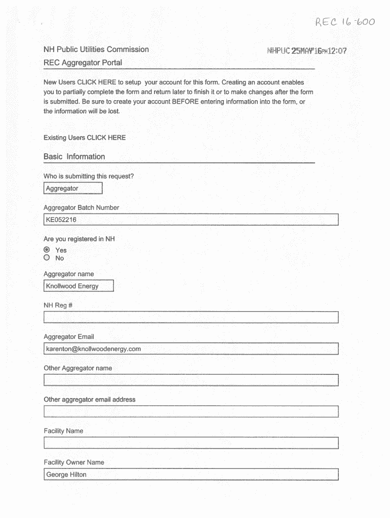 Re too NH Public Utilities Commission HF1iC 2%?4Wi12:O7 REC Aggregator Portal New Users CLICK HERE to set up your account for this form. Creating an account enables you to partially complete the form
