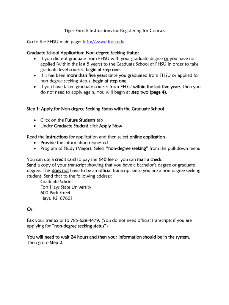 Tiger Enroll: Instructions for Registering for Courses Go to the FSU main page: http://www.fhsu.edu Graduate School Application: Nondegree Seeking Status: If you did not graduate from FSU with your