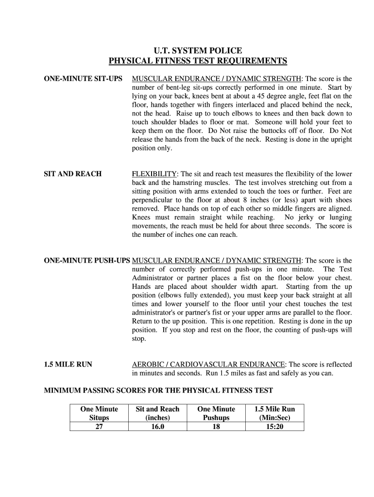 U.T. SYSTEM POLICE PHYSICAL FITNESS TEST REQUIREMENTS MINUTE SETUPS MUSCULAR ENDURANCE / DYNAMIC STRENGTH: The score is the number of Bentley setups correctly performed in one minute. Start by lying