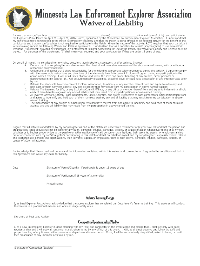 Get the free Shoot Waiver Liability Form - Minnesota Law Enforcement Explorer ... - mnleexplorer