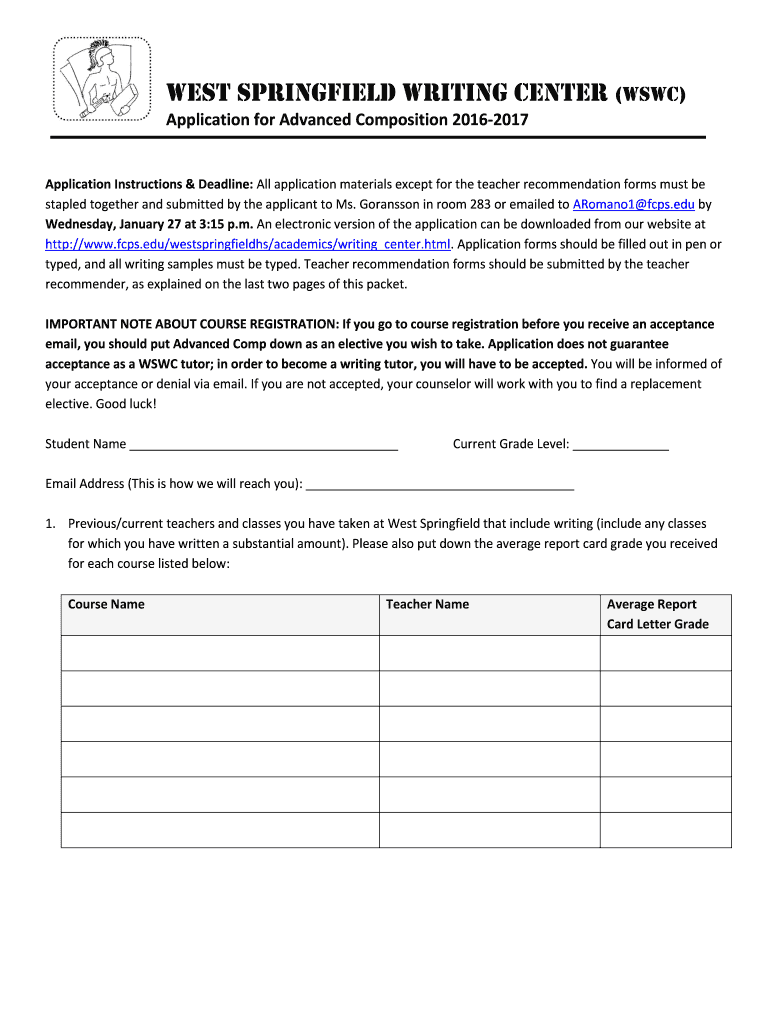 West Springfield Writing Center (WSW) Application for Advanced Composition 2016-2017. Application Instructions & Deadline: All application materials except for.