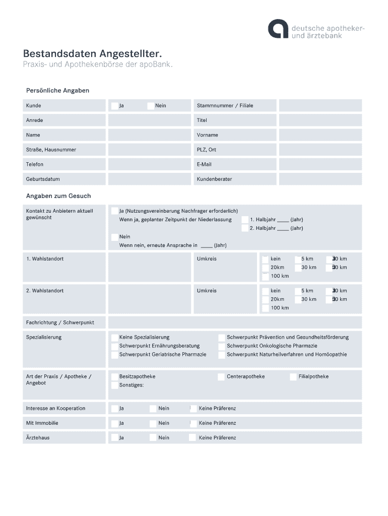 Bestandsdaten Angestellter. Praxis- UND Apothekenb RSE her Rabobank. Under JA Nan Stammnummer / Filial Agreed Title Name Surname Star e, Hausnummer PLY, ORT.