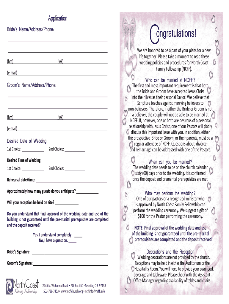 Application Brides Name/Address/Phone: (hm) (wk) (email) Grooms Name/Address/Phone: (hm) (wk) (email) Desired Date of Wedding: 1st Choice: 2nd Choice: Desired Time of Wedding: 1st Choice: 2nd Choice: