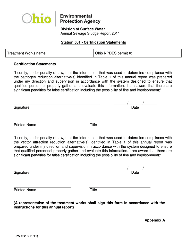 Division of Surface Water Annual Sewage Sludge Report 2011 Station 581 Certification Statements Treatment Works name: Ohio NODES permit #: Certification Statements “I certify, under penalty of law,