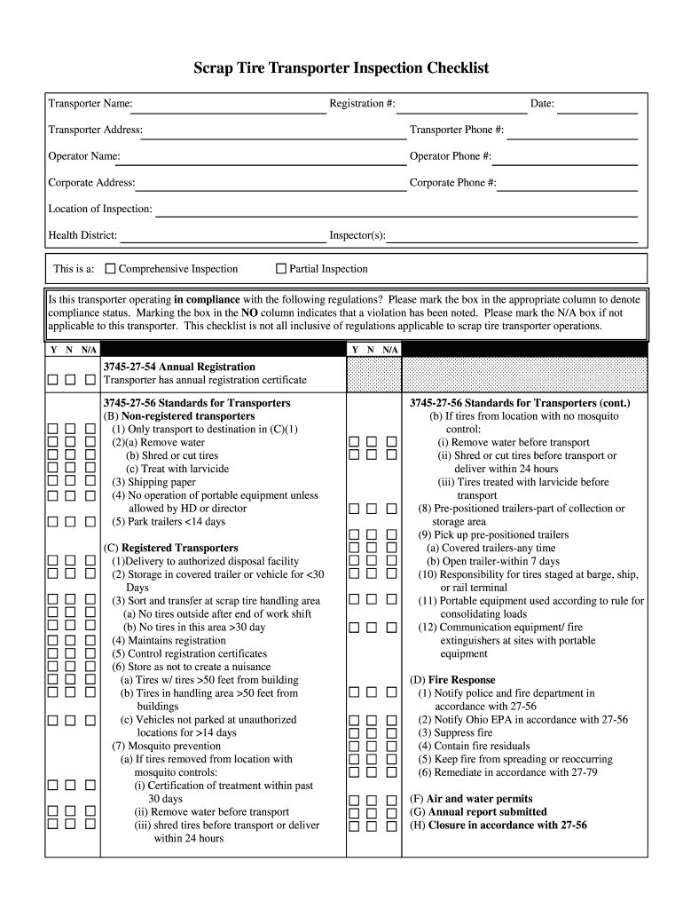 Scrap Tire Transporter Inspection Checklist Transporter Name: Registration #: Date: Transporter Address: Transporter Phone #: Operator Name: Operator Phone #: Corporate Address: Corporate Phone #: