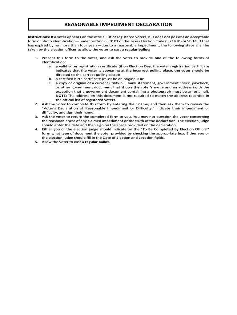 Get the free reasonable impediment declaration - Texas Secretary of State - sos state tx