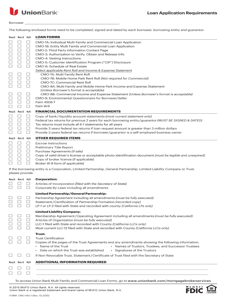 Any individual or organization applying for a loan from a financial institution is required to file cmo-info-1 loan application requirements.
