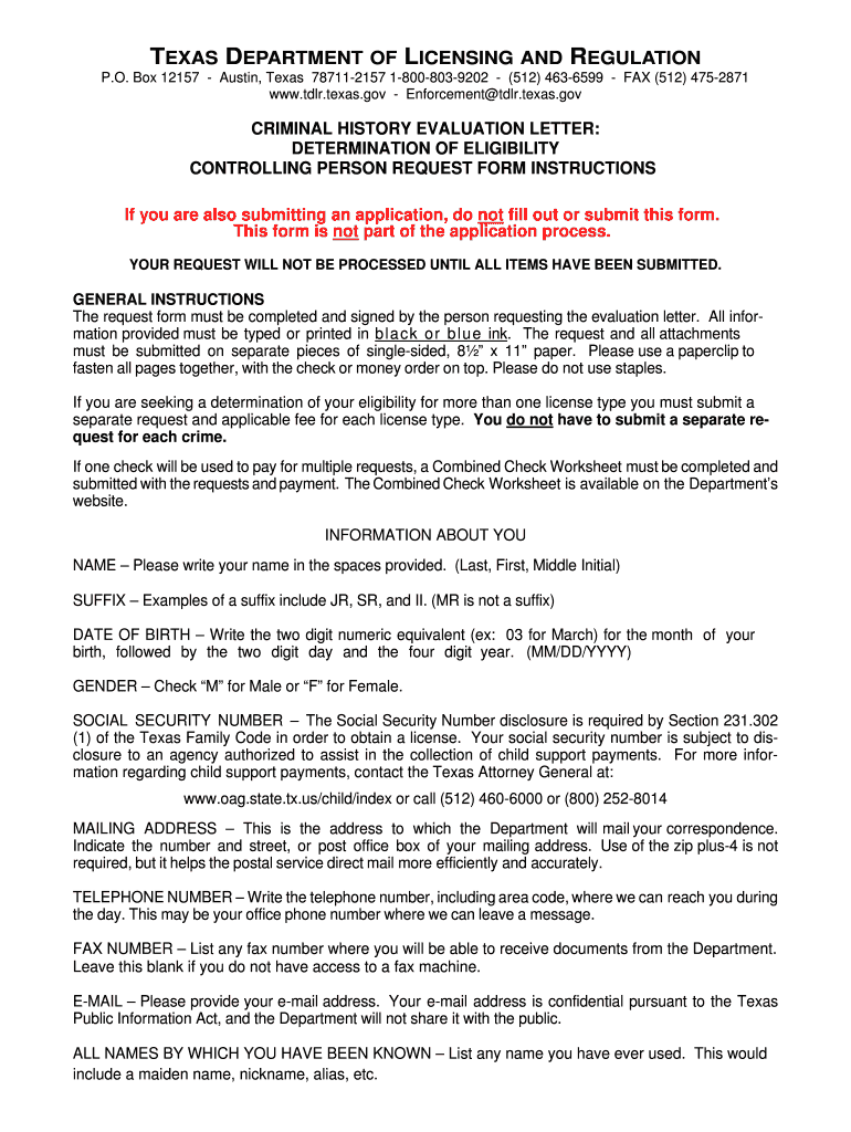 TEXAS DEPARTMENT OF LICENSING AND REGULATION P.O. Box 12157 Austin, Texas 787112157 18008039202 (512) 4636599 FAX (512) 4752871 www.tdlr.texas.gov Enforcement DLR.Texas.gov CRIMINAL HISTORY EVALUATION