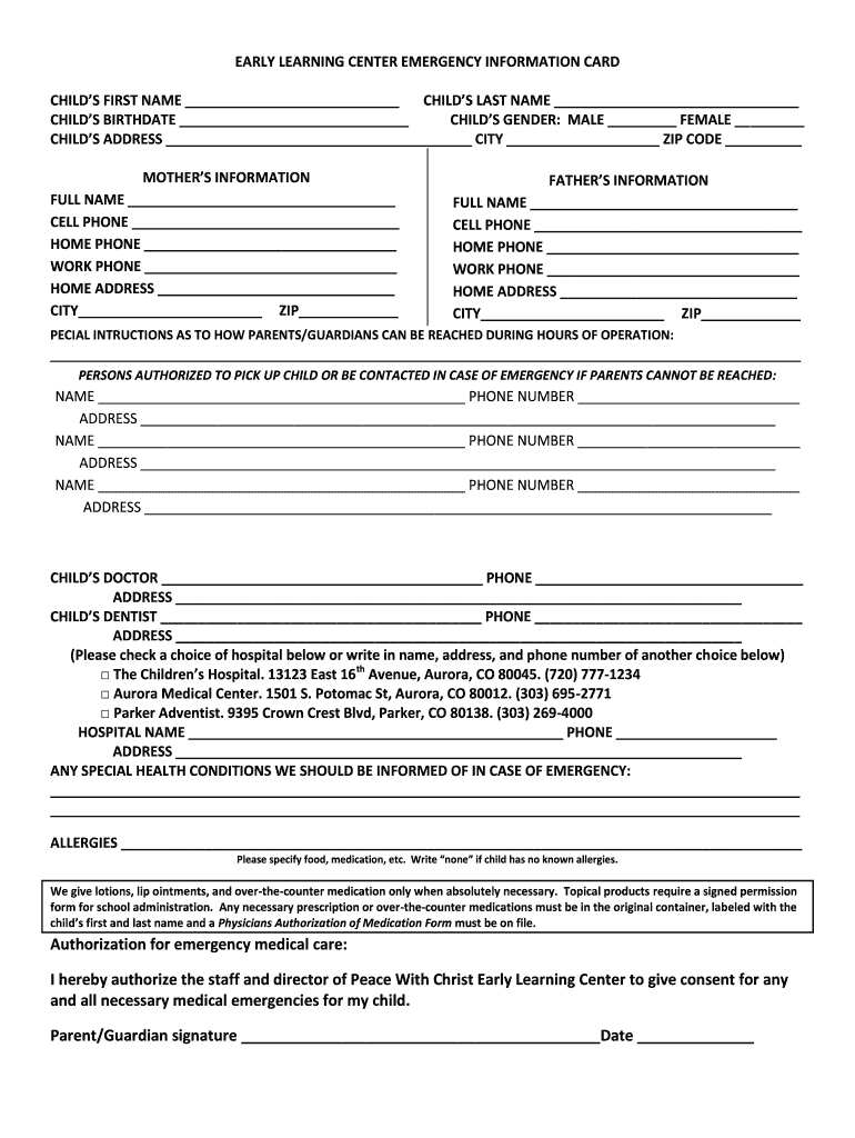 EARLY LEARNING CENTER EMERGENCY INFORMATION CARD CHILD FIRST NAME CHILD LAST NAME CHILD BIRTHDATE CHILD GENDER: MALE FEMALE CHILD ADDRESS CITY ZIP CODE MOTHERS INFORMATION FULL NAME CELL PHONE HOME