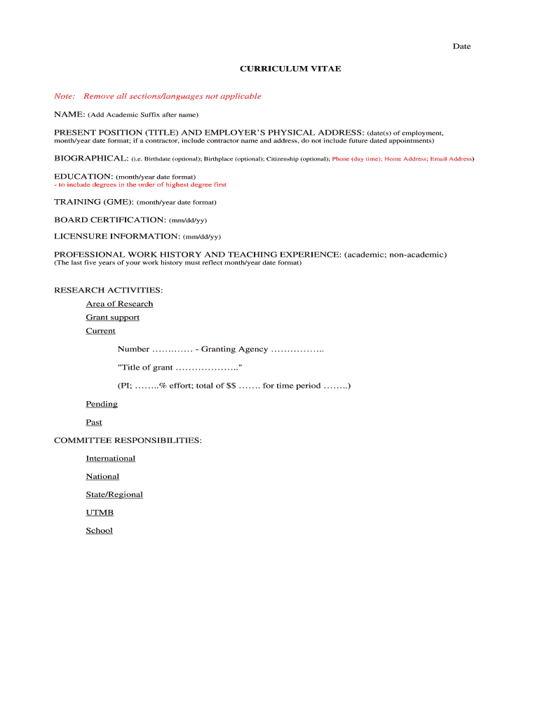 Date CURRICULUM Vicente: Remove all sections/languages not applicable NAME: (Add Academic Suffix after name) PRESENT POSITION (TITLE) AND EMPLOYERS PHYSICAL ADDRESS: (date(s) of employment, month/year