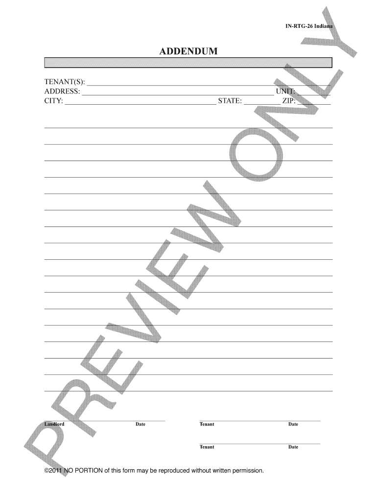 ON LY INRTG26 Indiana ADDENDUM TENANT(S): ADDRESS: UNIT: CITY: STATE: ZIP: W IE EV PR Landlord Date Tenant Date 2011 NO PORTION of this form may be reproduced without written permission.