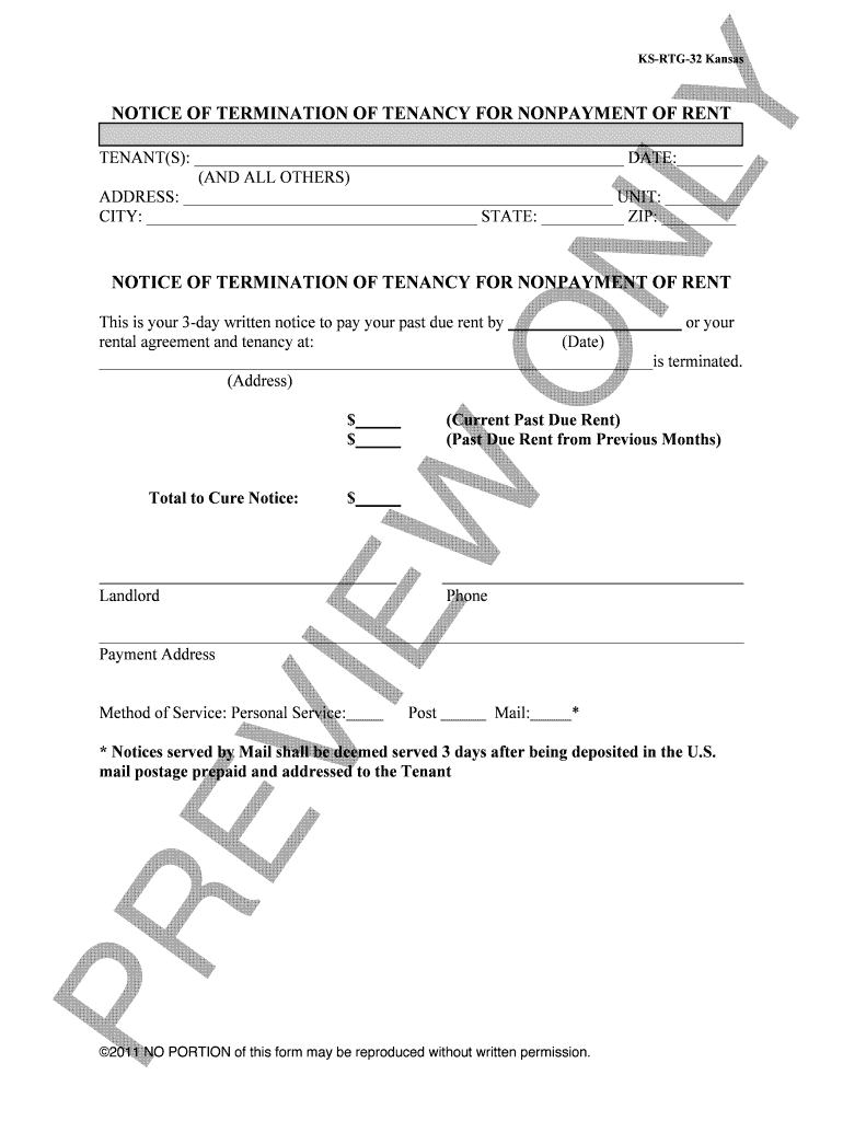 ON LY KSRTG32 Kansas NOTICE OF TERMINATION OF TENANCY FOR NONPAYMENT OF RENT TENANT(S): DATE: (AND ALL OTHERS) ADDRESS: UNIT: CITY: STATE: ZIP: NOTICE OF TERMINATION OF TENANCY FOR NONPAYMENT OF RENT