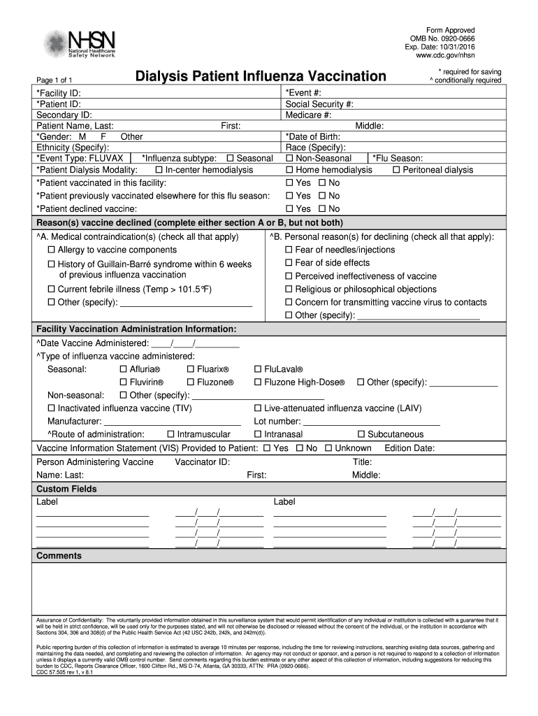 Form Approved OMB No. 09200666 Exp. Date: 10/31/2016 www.cdc.gov/nhsn Page 1 of 1 Dialysis Patient Influenza Vaccination *Facility ID: *Patient ID: Secondary ID: Patient Name, Last: First: *Gender: