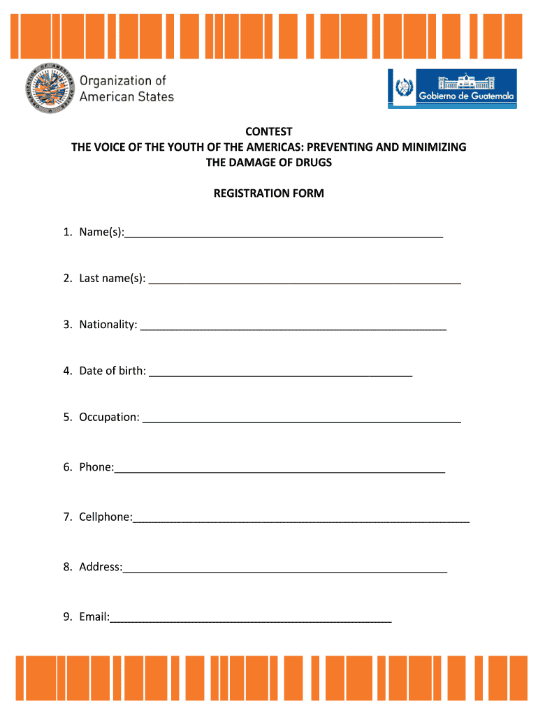 CONTEST THE VOICE OF THE YOUTH OF THE AMERICAS: PREVENTING AND MINIMIZING THE DAMAGE to DRUGS REGISTRATION FORM 1. Name(s): 2. Last name(s): 3. Nationality: 4. Date of birth: 5. Occupation: 6. Phone: