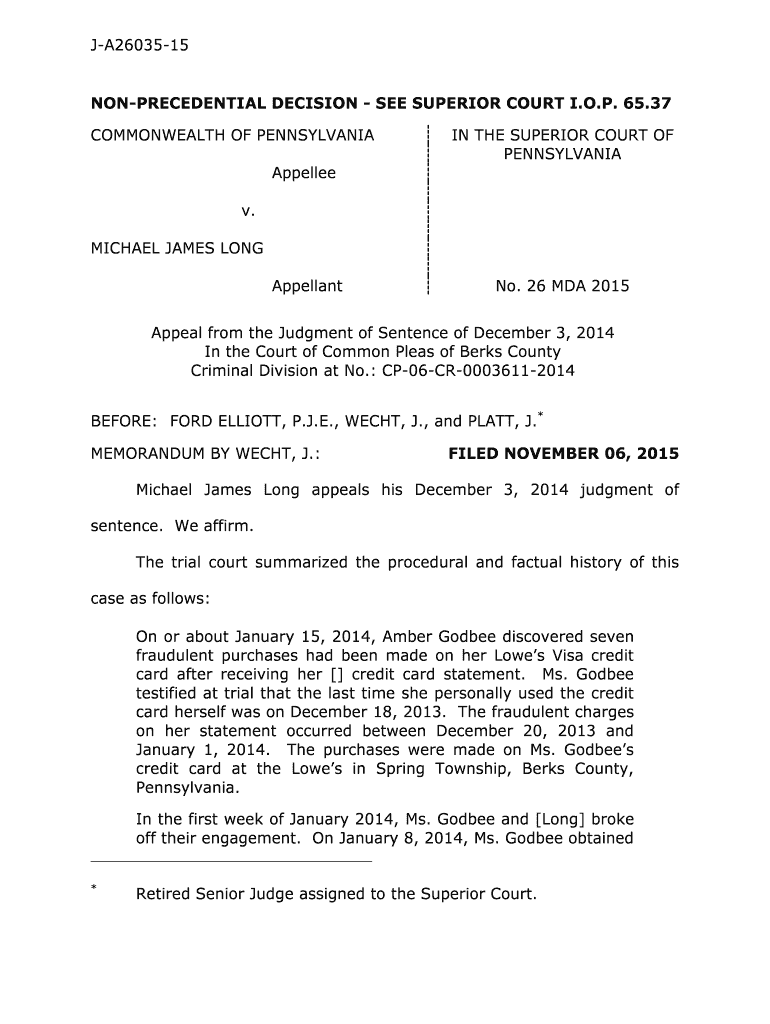 JA2603515 NONRESIDENTIAL DECISION SEE SUPERIOR COURT I.O.P. 65.37 COMMONWEALTH OF PENNSYLVANIA IN THE SUPERIOR COURT OF PENNSYLVANIA Appealed v. MICHAEL JAMES LONG Appellant No. 26 MDA 2015 Appeal