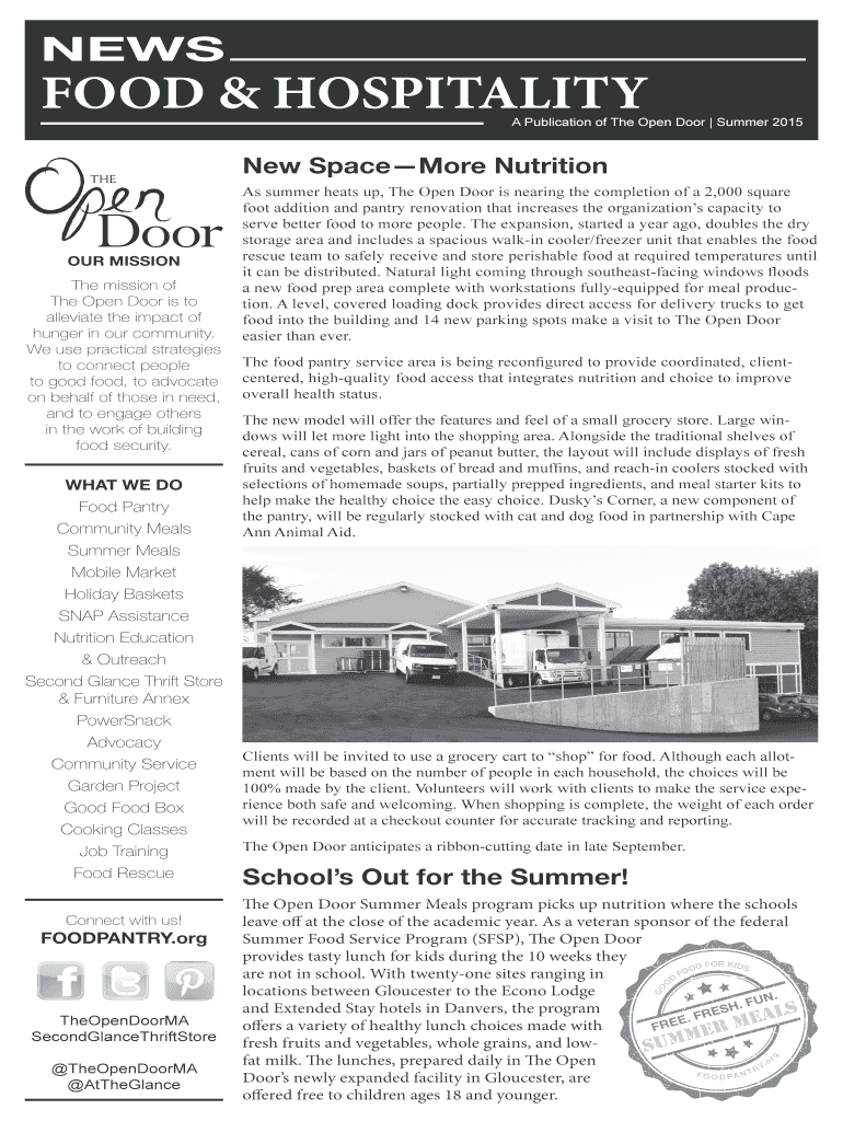 NEWS FOOD & HOSPITALITY A Publication of The Open Door Summer 2015 New Space More Nutrition OUR MISSION The mission of The Open Door is to alleviate the impact of hunger in our community. We use practical