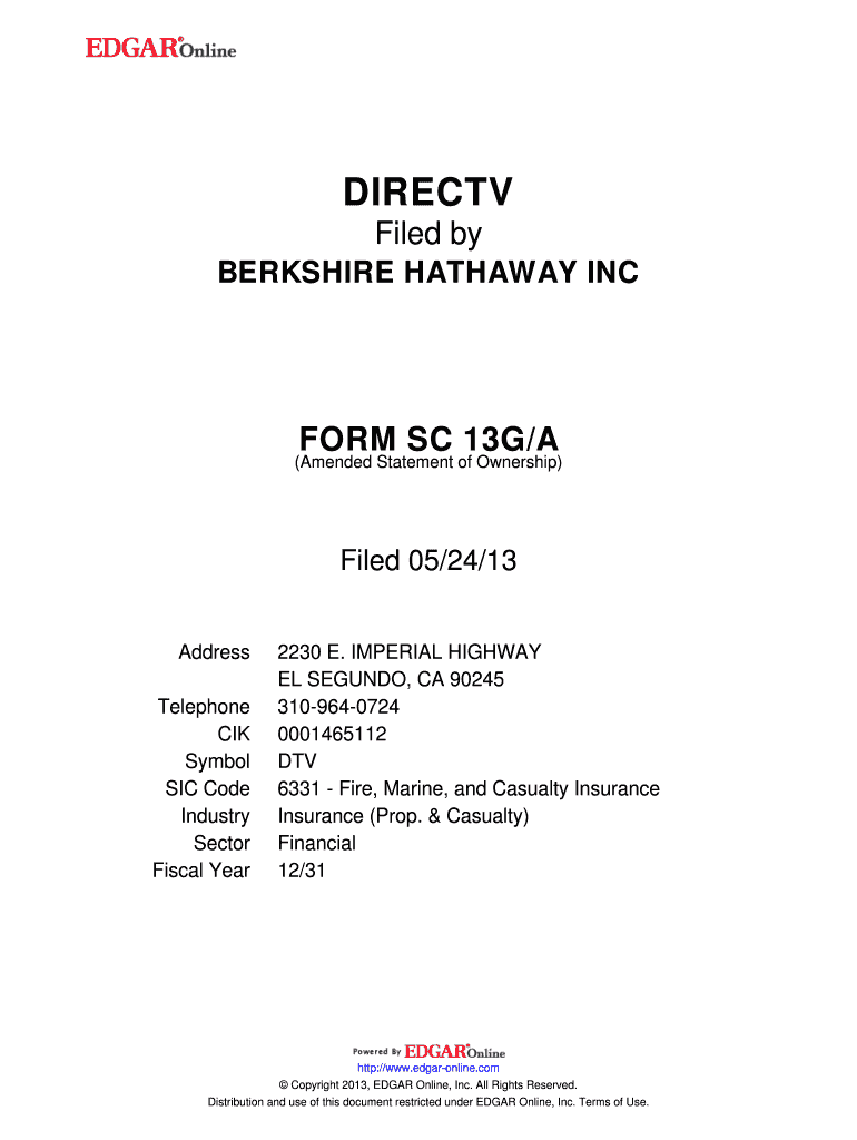 DirecTV Filed by BERKSHIRE HATHAWAY INC FORM SC 13G/A (Amended Statement of Ownership) Filed 05/24/13 Address Telephone CIK Symbol SIC Code Industry Sector Fiscal Year 2230 E. IMPERIAL HIGHWAY EL