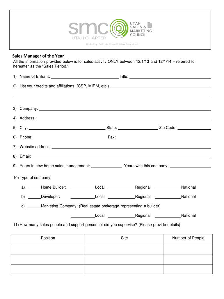 Sales Manager of the Year All the information provided below is for sales activity ONLY between 12/1/13 and 12/1/14 referred to hereafter as the Sales Period. 1) Name of Entrant: Title: 2) List your