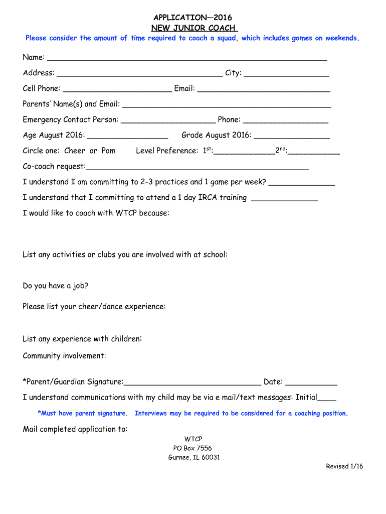 APPLICATION2016 NEW JUNIOR COACH Please consider the amount of time required to coach a squad, which includes games on weekends. Name: Address: City: Cell Phone: Email: Parents Name(s) and Email: