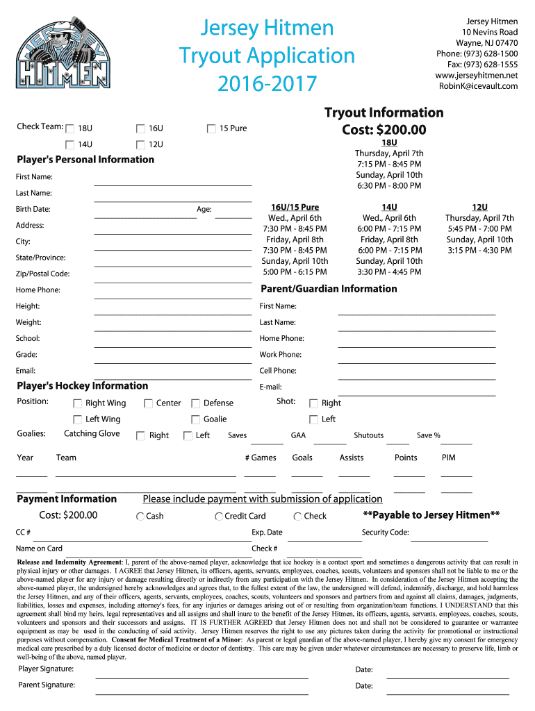 Jersey Hitmen Tryout Application 2016-2017. Jersey Hitmen 10 Nevis Road Wayne, NJ 07470 ... Player Signature: Parent Signature: Date: Title: Jersey Hitmen Application.